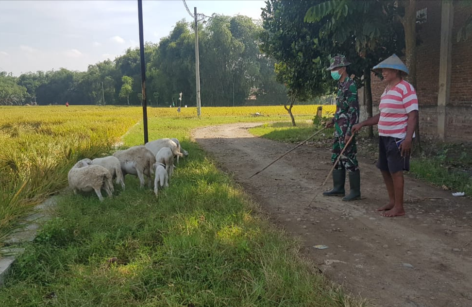 Serda Sukarji anggota Satgas TMMD Reguler Kodim pada sore hari, Rabu (14/7/2021) setelah kegitan pengecoran jalan selesai, memyempatkan waktu berkomunikasi dengan Pak Rusman yang sedang menggembala dombanya di pinggir jalan tidak jauh dari lokasi pengecoran jalan sasaran fisik TMMD.