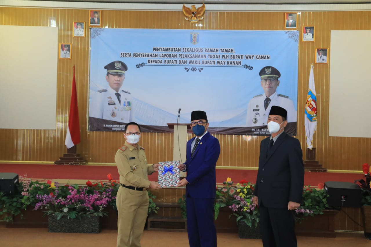 Kliksumatera.com, WAY KANAN- Acara penyambutan sekaligus ramah tamah serta laporan penyerahan tugas PLH Bupati Way Kanan dengan Bupati Way Kanan dan Wakil Bupati Way Kanan, berlangsung di Gedung Serba Guna Pemkab Way Kanan, Senin 1 Maret 2021.