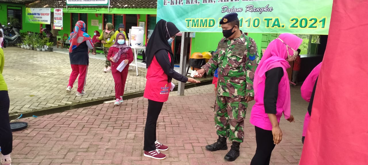 Bojonegoro – Ketegasan Anggota Satgas TMMD ke 110 Kodim 0813/Bojonegoro yang dilakukan oleh Kopral Kepala Bono, terhadap setiap warga yang akan mengikuti kegiatan non fisik ini yang dilaksanakan dilokasi sasaran program, Sabtu (13/03/2021).