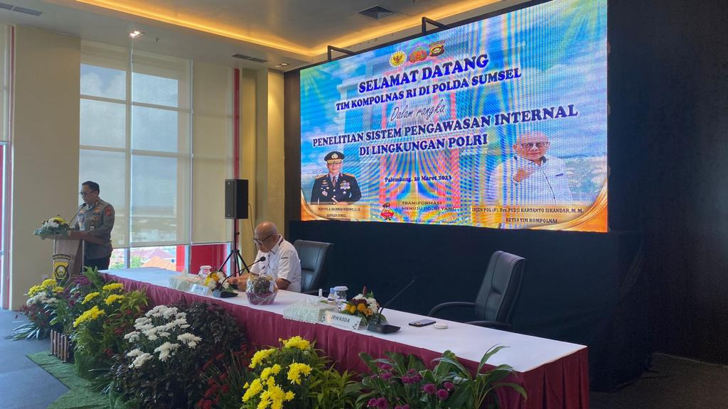 Kliksumatera.com, PALEMBANG- Kapolda Sumatera Selatan Irjen Pol. A. Rachmad Wibowo SIK diwakili Irwasda Kombes Pol Ulung Sampurna Jaya SIK MH MSI didampingi Ketua Tim Kompolnas RI.Irjen Pol Pudji Hartanto Iskandar MM membuka penelitian oleh Kompolnas Republik Indonesia di Mapolda Sumsel ruang lounge lantai 7 Gedung Utama Presisi Mapolda Sumsel KM 4 Palembang, Senin 20/3/2023.