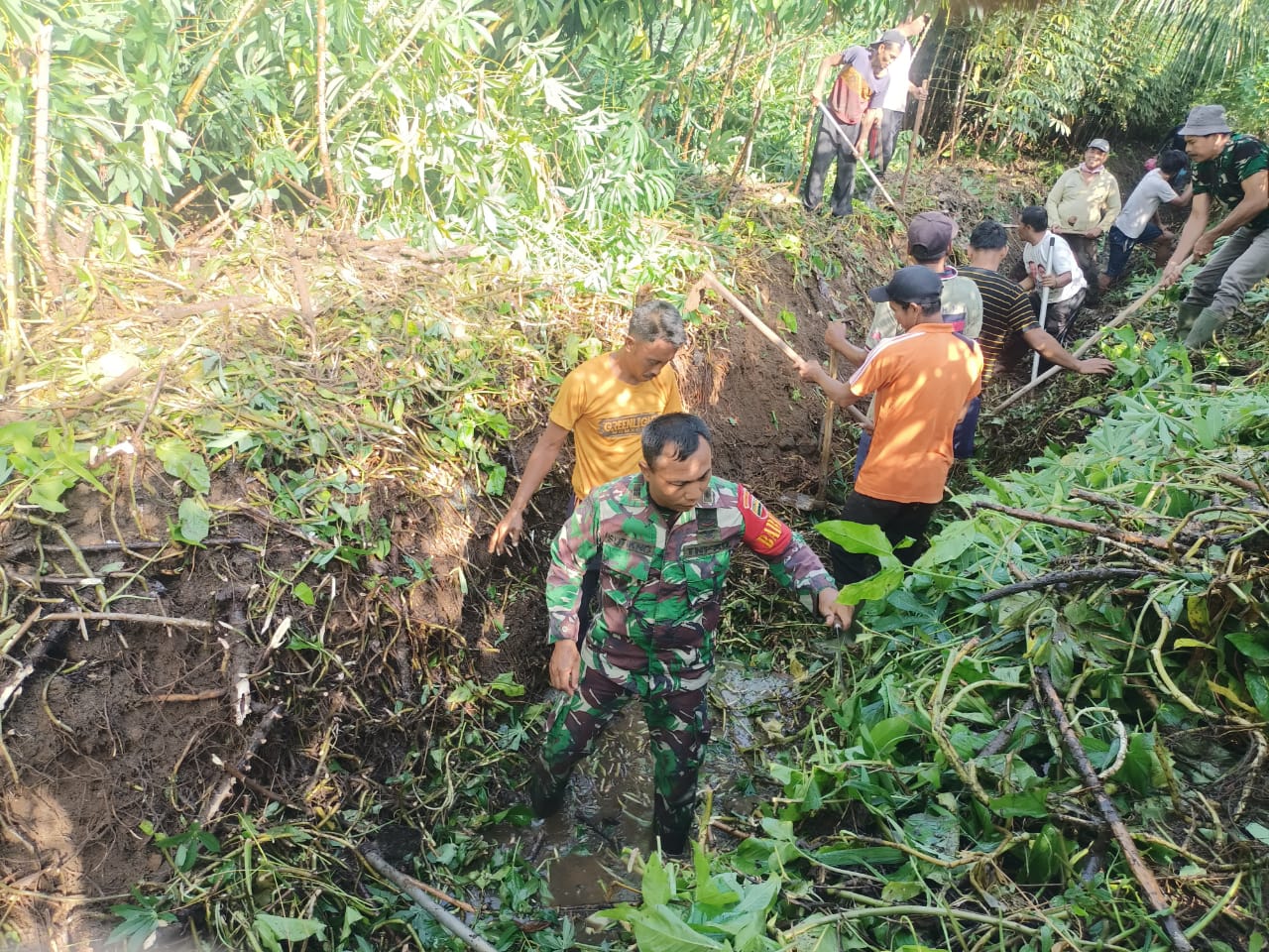 Dalam suasana kerja yang penuh semangat, Peltu Sutikno dan sejumlah anggota Satgas TMMD terlihat bahu membahu bersama masyarakat setempat. Mereka menggunakan cangkul dan alat seadanya untuk menggali lumpur dan memotong tanaman liar yang menutupi saluran. Terlihat Peltu Sutikno terjun langsung ke parit yang berlumpur, memberikan contoh nyata kepemimpinan di lapangan.