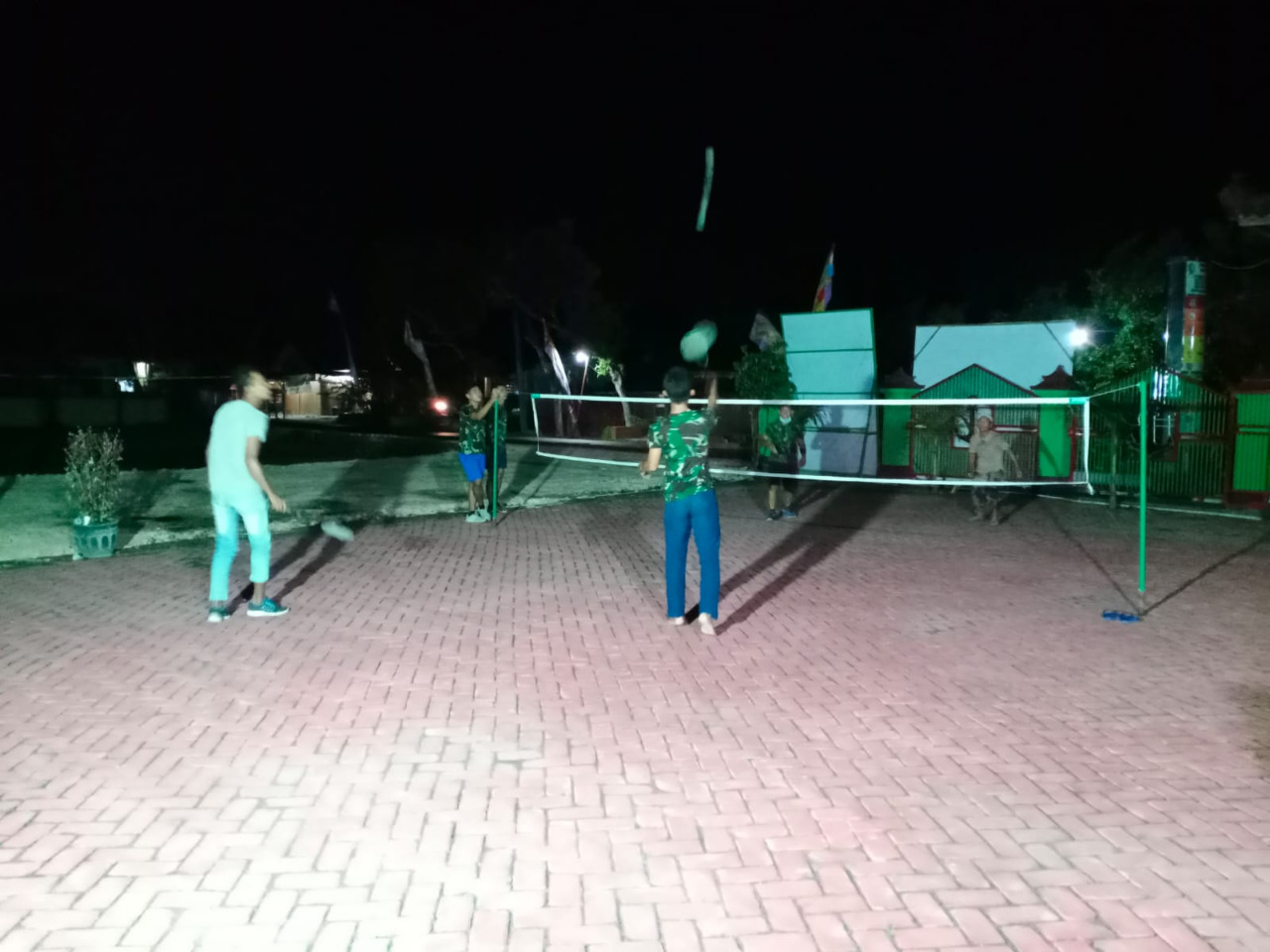 Kegiatan olahraga saat malam hari ini dengan bermain bulu tangkis sesama anggota Satgas TMMD ke-110 di halaman Balai Desa Ngrancang, Kecamatan Tambakrejo, Kabupaten Bojonegoro yang telah disiapkan oleh Pihak Pemdes.