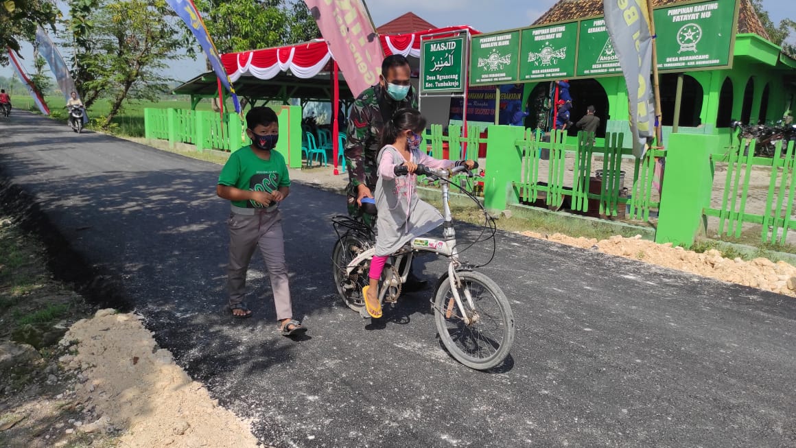 BOJONEGORO – Disela Berangkat Kerja mengerjakan fisik program TMMD 110 Kodim 0813/Bojonegoro, Koptu Benny, Satgas TMMD menyempatkan waktu mengajari anak – anak naik sepeda. Jum’at (19/03/2021).