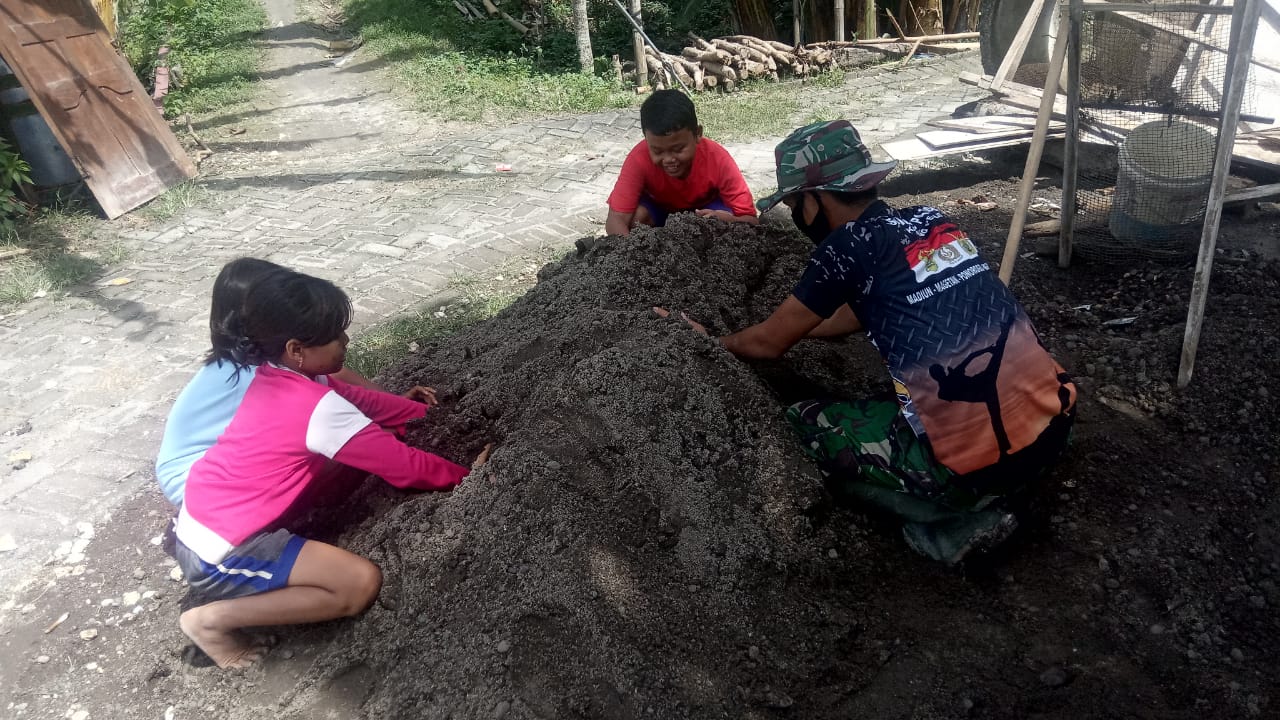“Saya saat jam istirahat mengajak anak-anak main pasir di lokasi TMMD,” ujar Prada Adi.