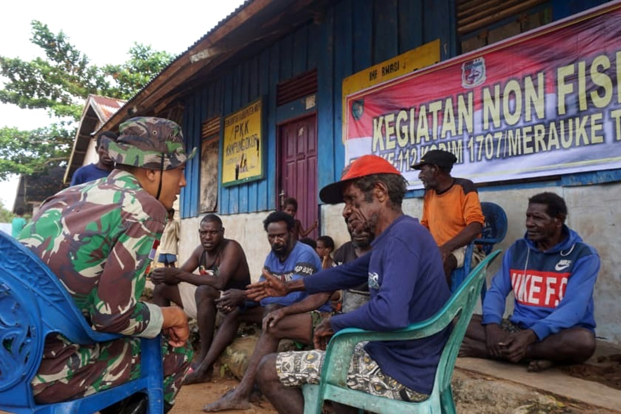MERAUKE – Untuk menjalin keakraban, personel Satgas TMMD Ke-112 Kodim 1707/Merauke Pratu Gunawan, melaksanakan kegiatan Komunikasi Sosial (Komsos) dengan tokoh masyarakat Kampung Okor, Kamis (9/9/2021).