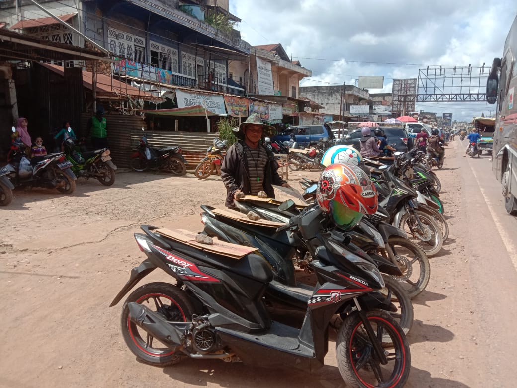 Tampak juga banyak motor yang terparkir di pinggir jalan. Selain itu, terlihat ada pedagang kaki lima yang berjualan di pinggir jalan.