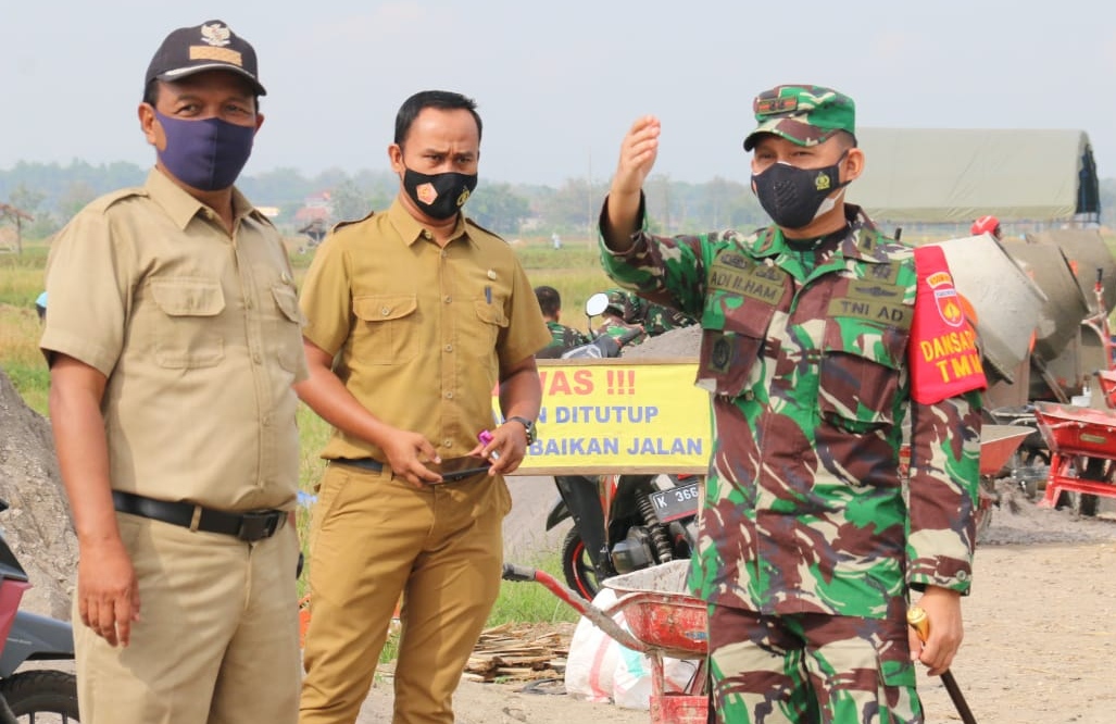 “Salah satu contohnya, pembangunan pengecoran jalan pertanian penghubung dua desa yakni Desa Tamansari ke Desa Sekararum Kecamatan Jaken. Dalam jangka waktu seminggu saja, pengecoran jalan sepanjang 1.450 meter sudah mencapai 30 persen. Memang pengerjaan dilakukan bersama-sama, tetapi dengan adanya Bapak-bapak TNI ini yang menjadikannya semangat mereka untuk ikut dalam kerja bhakti,” ungkapnya.