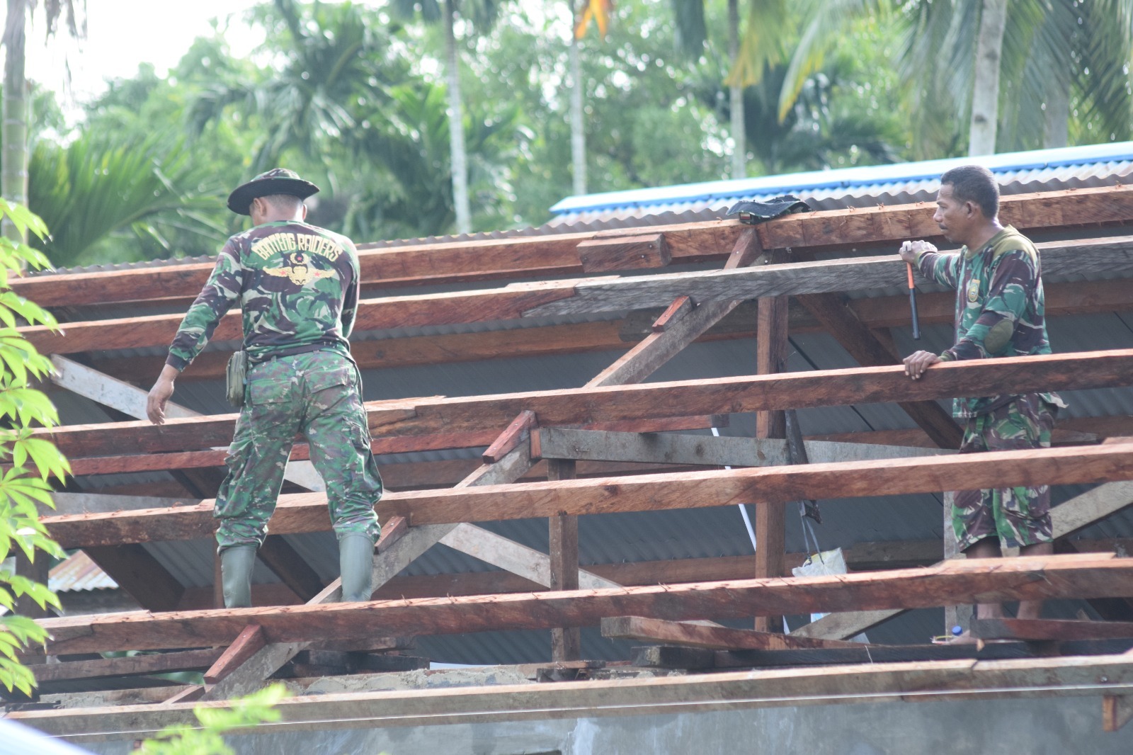 SORONG – Gotong royong dan membantu segala kegiatan pelaksanaan Program TMMD Ke – 124 Kodim 1802/Sorong adalah kewajiban seluruh satuan tugas (Satgas). Salah satu perehab 8 unit RTLH telah memasuki baru pemasangan atap. Serka Ridwan terlihat memasang dan menyusun hingga sama kayu yang akan segera di paku kerangka atap. Lokasi TMMD Bertempat kampung yeflio distrik mayamuk kabupaten sorong provinsi papua barat daya. Rabu (14/05/2025).