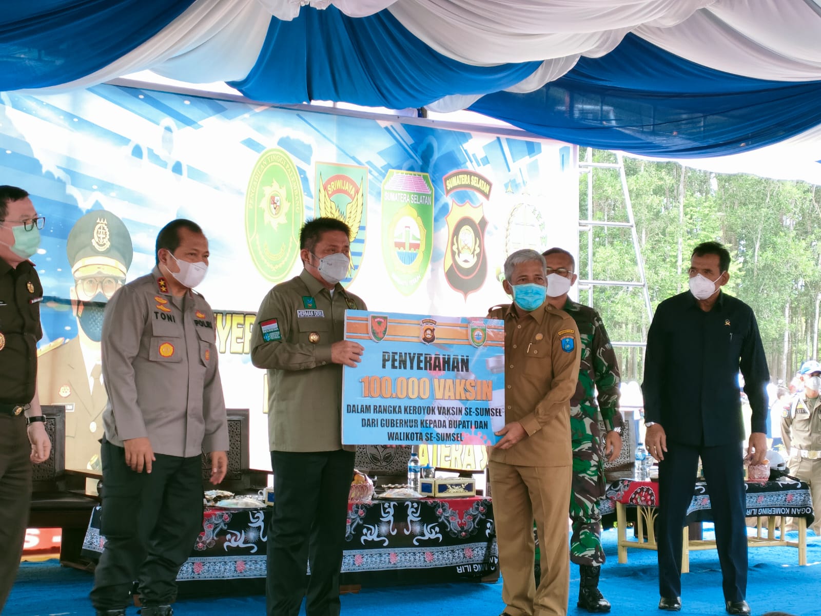 Selain monitoring dan asistensi pelaksanaan vaksinasi yang bertajuk, “Keroyokan Vaksinasi Provinsi Sumsel” kunjungan kerja ke Kab.OKI tersebut dilaksanakan dalam rangka penyerahan 100 ribu Vaksin Covid-19 dari Pemprov Sumsel kepada Bupati/ Walikota se-Prov. Sumsel.