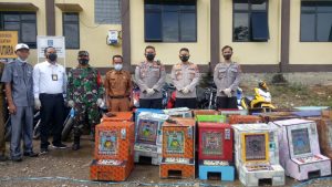 Hal itu ditegaskan Kapolres Muratara AKBP Eko Sumaryanto SIK saat jumpa pers Senin (14/6/2021) kemarin. ”Ya, pada hari Sabtu tanggal 12/6/2021 sekitar pukul 05.00 pagi, saya dibantu Batalyon Brimob langsung bergerak menuju Desa Sarolangun Kecamatan Rawas Ulu Kabupaten Muratara. Sebelumnya kami telah mendapat informasi kampung tersebut sebagai tempat transaksi narkoba dan narkotika. Dan penggerebekan ini saya pimpin langsung. Alhamdulillah kami berhasil mengamankan 17 (tujuh belas orang masyarakat). Di antaranya 14 orang laki-laki dan 3 orang perempuan yang diduga ikut dalam kelompok yang kami curigai. Dan juga kami telah menemukan beberapa barang bukti. Di antaranya puluhan senjata tajam dan 1 satu senjata api rakitan laras panjang, 3 senjata api rakitan laras pendek beserta amunisinya. Juga, 50 hp berbagai macam jenis, 11 bong/alat pengisap sabu, 26 yunit kendaraan roda dua/sepeda motor berbagai macam merk dan nopol. Narkoba jenis sabu sabu 34,20 gram, uang tunai Rp 18.400,000 (delapan belas juta empat ratus ribu rupiah), serta kami juga mengamankan 34 unit mesin ding dong/bar bar,” papar Kapolres.