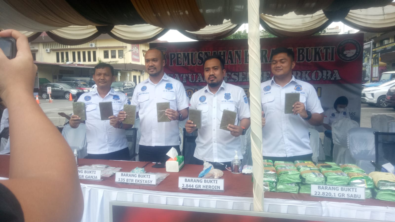 Sebanyak 23 kg barang bukti yang dimusnahkan tersebut merupakan hasil operasi dari 4 kali penangkapan. Ada 8 orang tersangka yang diamankan, salah satunya seorang wanita yang merupakan suami istri.