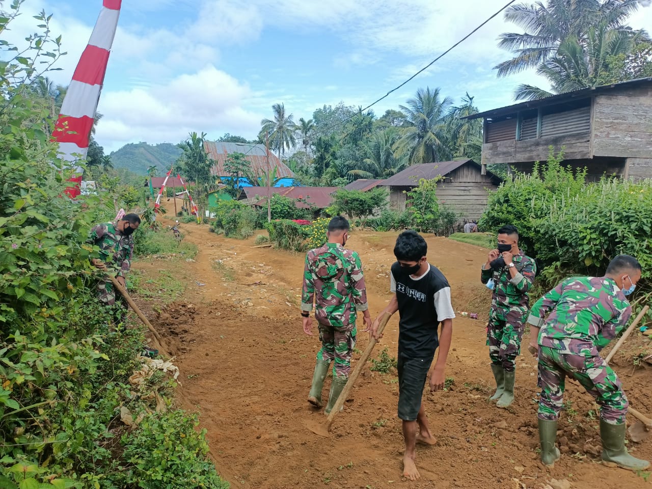 Warga di Dusun Tangga Batu, Desa Siuhom, Kec. Angkola Barat, Kabupaten Tapanuli Selatan bahu membahu bersama anggota TNI Kodim 0212/TS untuk mempersiapkan pelaksanaan TNI Manunggal Membangun Desa (TMMD) Reguler 111 Tahun Anggaran 2021.