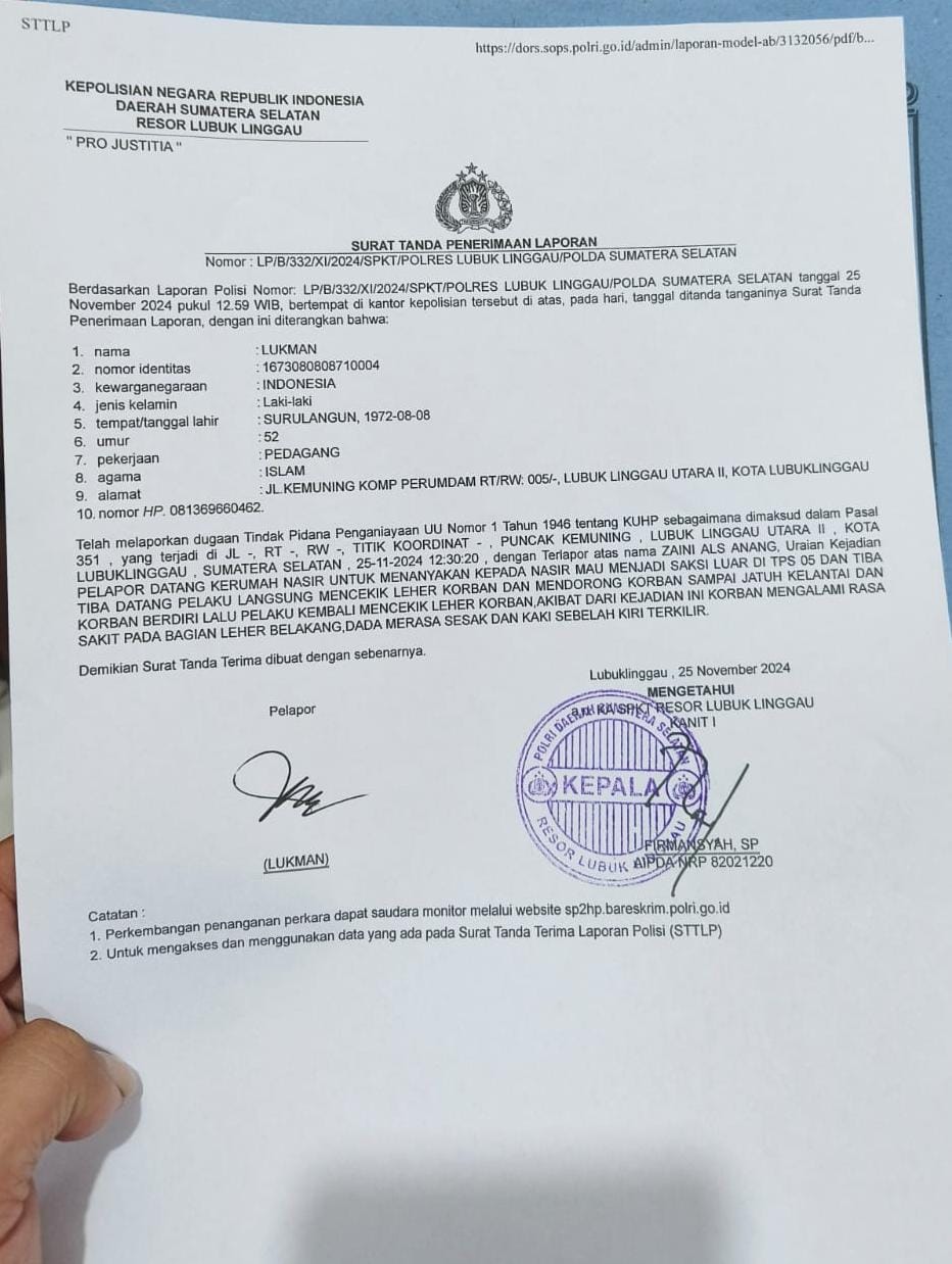 Laporan tersebut tercatat dalam Tanda Penerimaan Laporan dengan nomor: LP/B/332/XI/2024/SPKT/POLRES LUBUK LINGGAU/POLDA SUMATRA SELATAN.