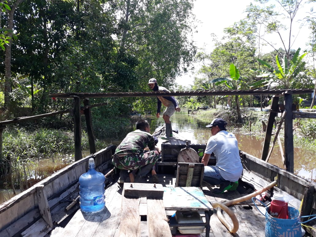 Kapuas,- Sertu Ari Satgas TMMD ke 110 Kodim 1011/KLK, berangkat menuju pembangunan jalan usaha tani sepanjang 1200 meter di Desa Saka Lagun, Kecamatan Pulau Petak, Kabupaten Kapuas, dengan menggunakan perahu kayu warga Jumat (19/3/2021).