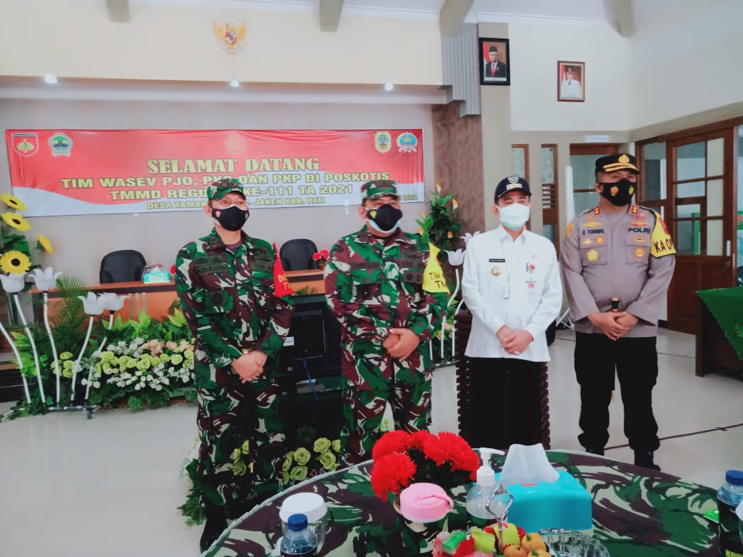 Didampingi Bupati Pati H. Haryanto, SH, MM, M.Si dan Kapolres Pati AKBP Christian Tobing, Dansatgas TMMD Reguler Ke-111 Letkol Czi Adi Ilham Zamani, S.E., M.I.Pol. menyambut langsung kunjungan Tim Pengawasan dan Evaluasi (Wasev) PJO TMMD Reguler 111 TA.2021. Jumat (9/7/2021)