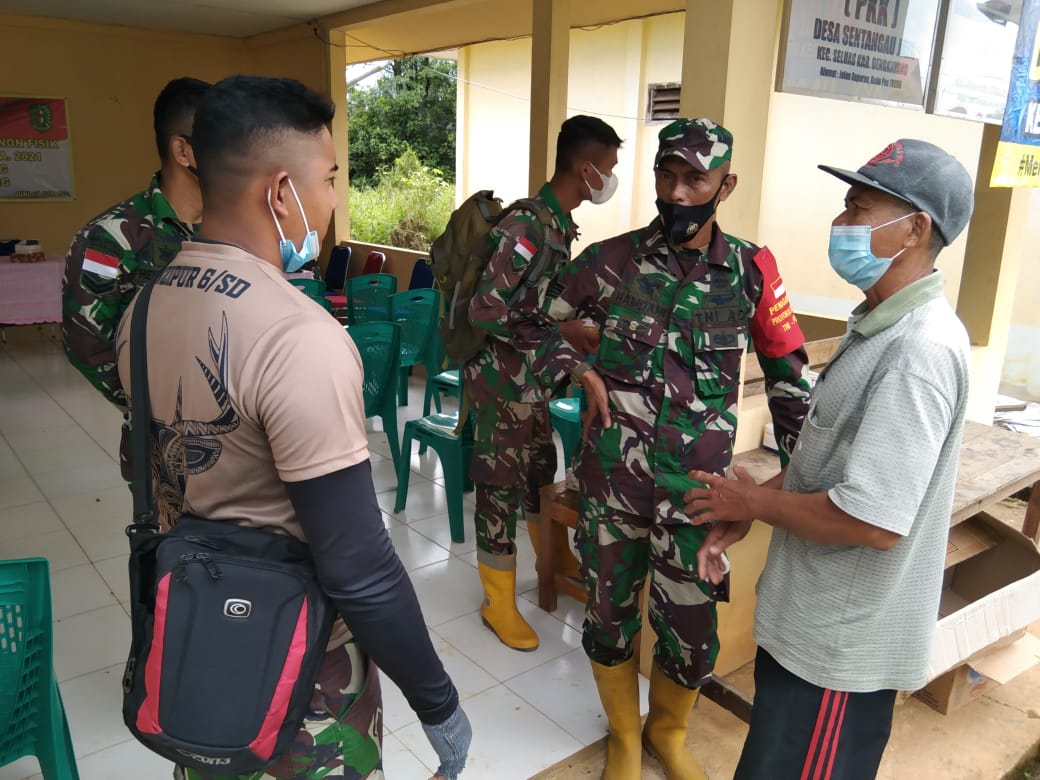 Bengkayang – Dalam pelaksanaan program TNI Manunggal Membangun Desa (TMMD) Ke-111 Kodim 1202/Singkawang menyelesaikan pekerjaan di sasaran Desa Sentangau Jaya, Kecamatan Seluas, Kabupaten Bengkayang tetap melaksanakan komunikasi sosial (Komsos) antara satgas TMMD bersama masyarakat.