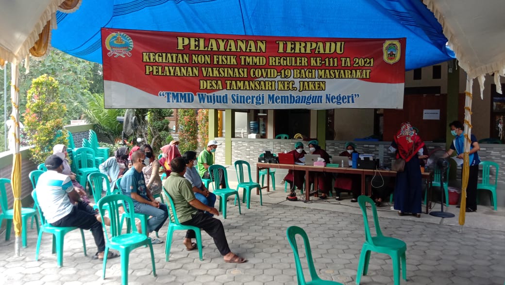 Saat ini Kodim 0718/Pati bekerjasama dengan Dinas Kesehatan di program TMMD Reguler Ke-111 melaksanakan kegiatan non fisik mengadakan Pelayanan Terpadu Vaksinasi Covid 19 bagi warga masyarakat Desa Tamansari, Kecamatan Jaken, Kabupaten Pati.
