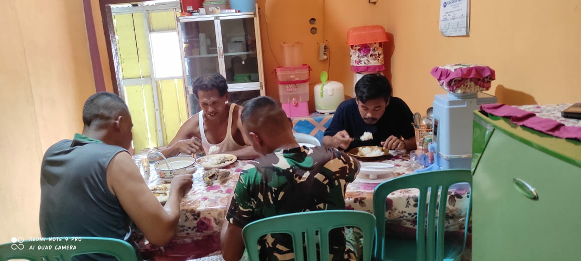 Suasana yang begitu nyaman dan terasa akrab, ditunjukan oleh prajurit yang mengikuti Satuan Tugas TMMD wilayah Kodim 1501/Ternate yang sedang menikmati makan siang bersama dengan warga masyarakat.