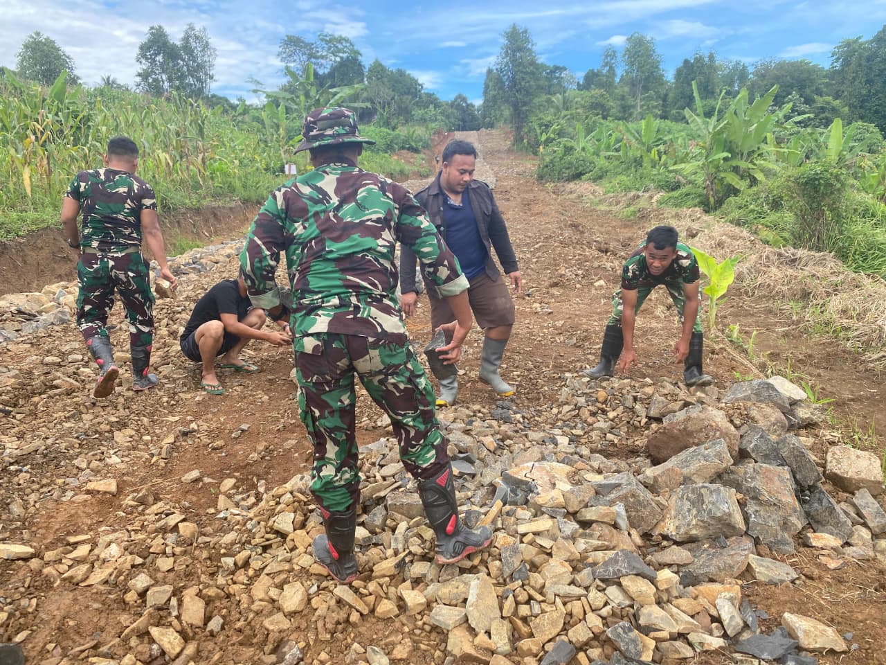 Selain itu, kegiatan TMMD ini juga mencerminkan nilai-nilai kemanunggalan TNI dengan rakyat. Melalui gotong royong dan kebersamaan, pekerjaan yang berat menjadi ringan dan penuh semangat. Warga sekitar tampak antusias membantu para prajurit dalam mengangkat dan menata batu, menunjukkan bahwa semangat kebersamaan masih hidup kuat di tengah masyarakat pedesaan.