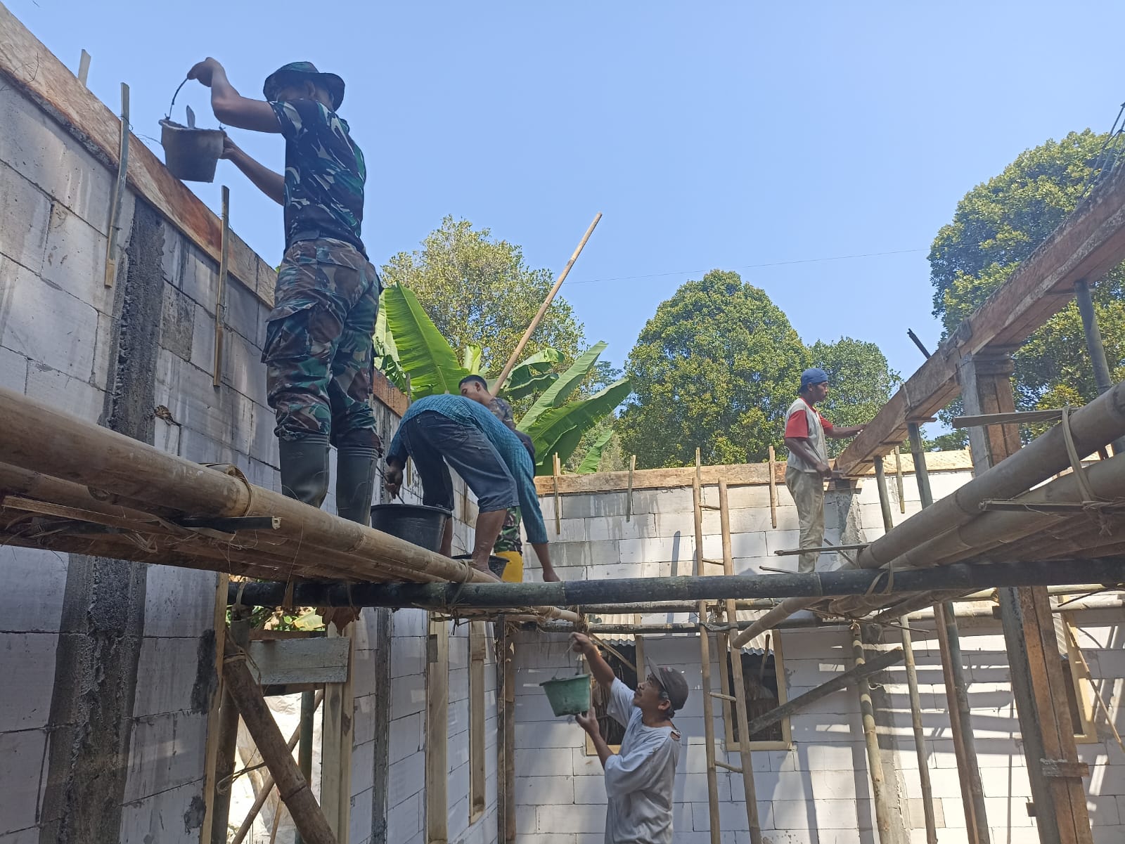 Tampak nyata renovasi Rumah Tidak Layak Huni (RTLH) milik, kaseno (49) yang berada di Desa Benowo hingga saat ini terus dilakukan. Satgas TMMD bersama masyarakat setempat dengan cekatan merenovasi rumah miliknya.