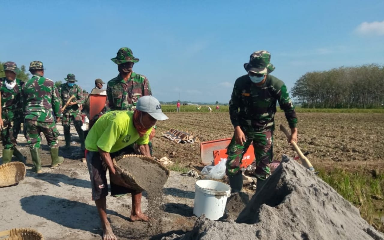 Pati – Semangat Warga Desa Tamansari dan anggota Satgas TMMD Reguler Ke-111 dalam pengerjaan jalan rabat beton program TMMD Reguler Ke-111 Kodim 0718/Pati sepanjang 1.450 meter dan lebar jalan 2,6 meter.