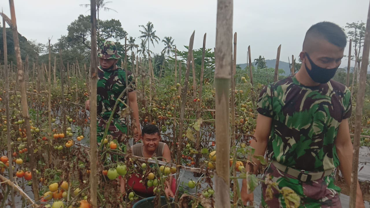 Satgas TMMD ke 111 kodim 0212/TS, Praka Jepri, membantu warga panen Tomat di Desa Siuhom, Kec Angkola Barat, Kab Tapanuli Selatan