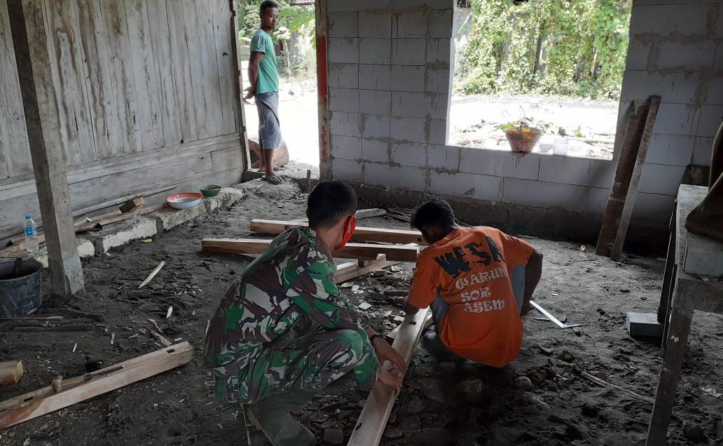 Tim Satgas TMMD ke-110 Kodim 0813/Bojonegoro membantu warga untuk penyelesaian RTLH. Seperti yang dilakukan Serda Samsuri bersama warga mengerjakan pembuatan Jendela membantu tukang mengambil bahan kayu.