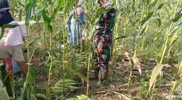 Satgas TMMD ke 111 Kodim 0212/TS anggota Satgas membantu warga di memanen jagung di Desa Siuhom Kecamatan Angkola Barat Kabupaten Tapanuli Selatan.