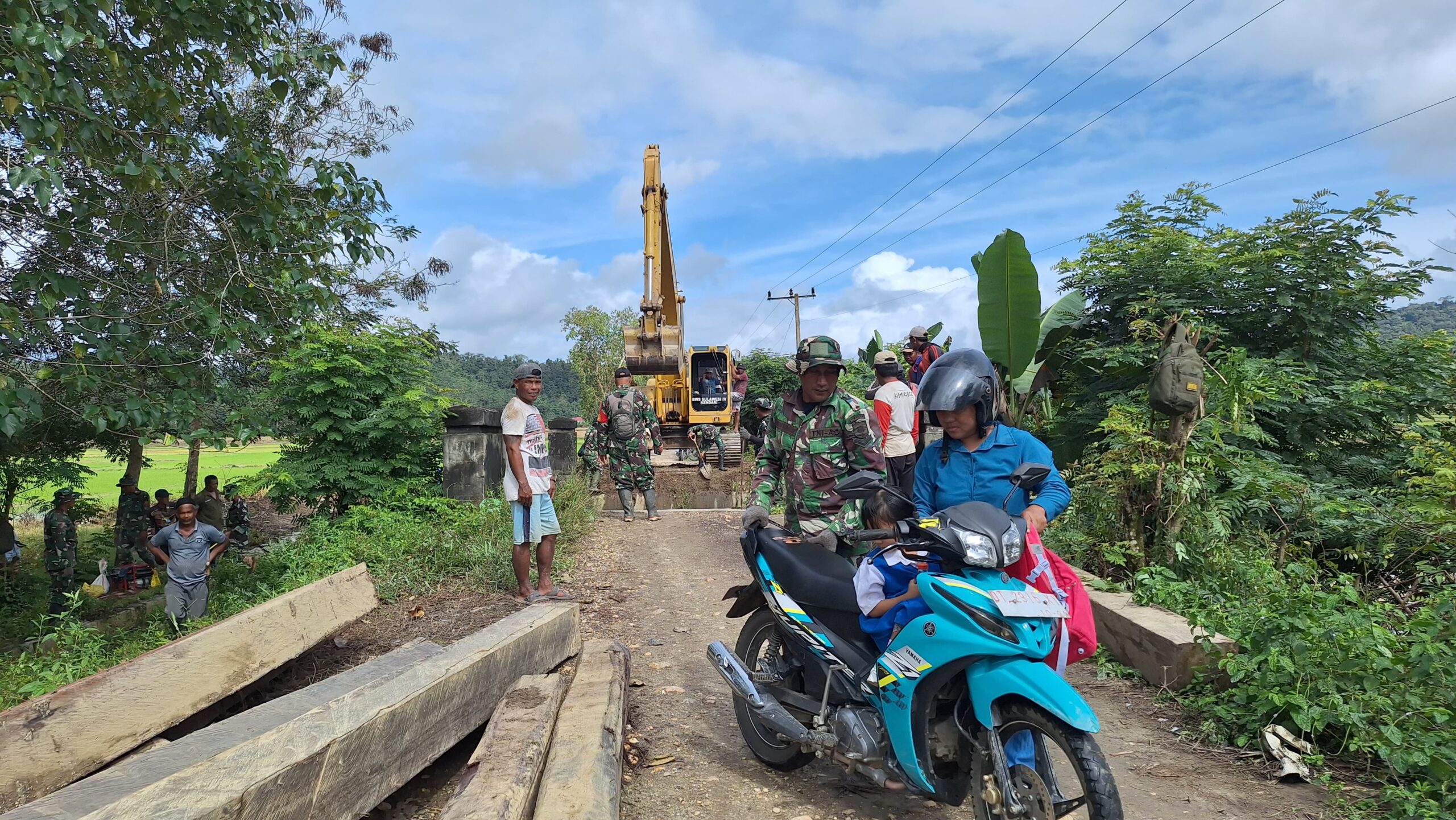 Jembatan yang sedang dikerjakan tersebut ternyata menjadi kendala bagi warga yang ingin menyebrangi sungai untuk mengantar anaknya ke sekolah. Namun, personil Satgas TMMD 125 dengan sigap membantu warga tersebut dengan menyediakan bantuan untuk menyebrangi jembatan yang sedang dikerjakan.