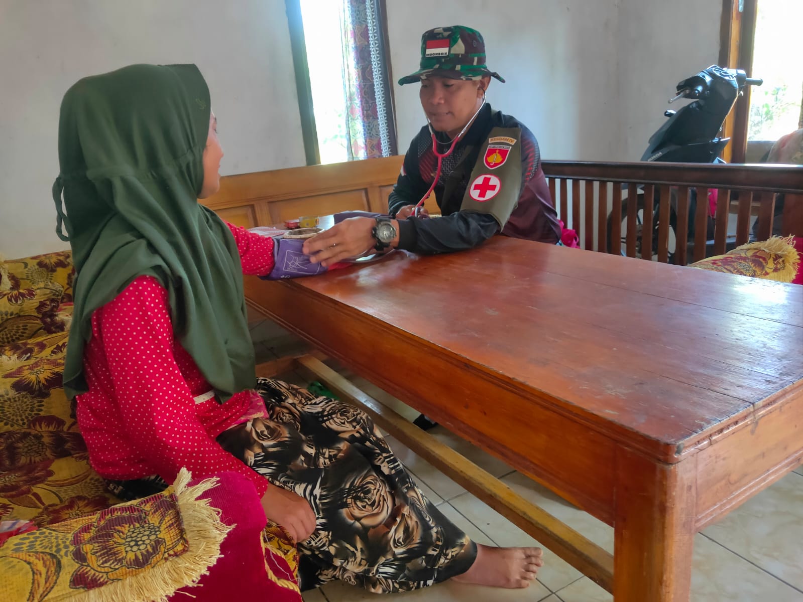 Tampak pengecekan yang dilakukan oleh Tim Keslap Satgas TMMD Serda Suranto kepada Ibu Sumarti (40) warga dusun Grumbul Sambeng desa Tambi yang sedang bermasalah dengan kesehatannya, Minggu (27/10/24).