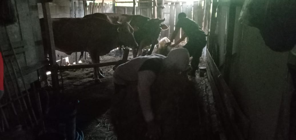 Kopda Anang Anggota Satgas TMMD ke 110 Kodim 0813/Bojonegoro yang melintas melihat wajah bahagia Pak Suyono sehingga menyempatkan waktu berkunjung ke kandang sapi.