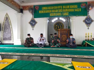 Kliksumatera.com, LAHAT- Momentum bulan Suci Ramadhan 1443 H tahun ini, Kodim 0405 Lahat menggelar kegiatan keagamaan. Yakni berupa Lomba Adzan tingkat SD dan Ibtidaiyah dan Lomba MTQ tingkat Madrasah Tsanawyah. Perlombaan ini digelar di Masjid Makodim 0405 Lahat, Selasa 26 April 2022.