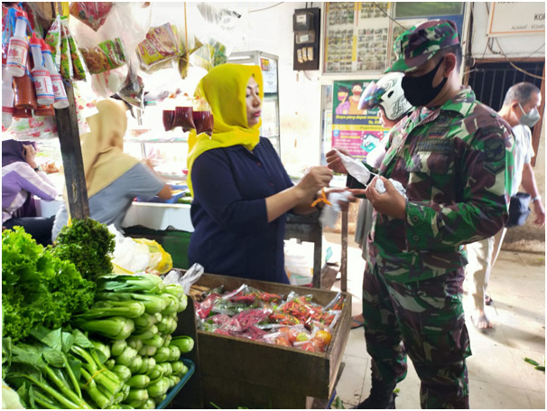 Pontianak – Kodim 1207/BS membagikan masker di pasar kemuning sebagai upaya memutus mata rantai penyebaran covid-19 yang rawan di tempat keramaian. Senin 31/5/2021
