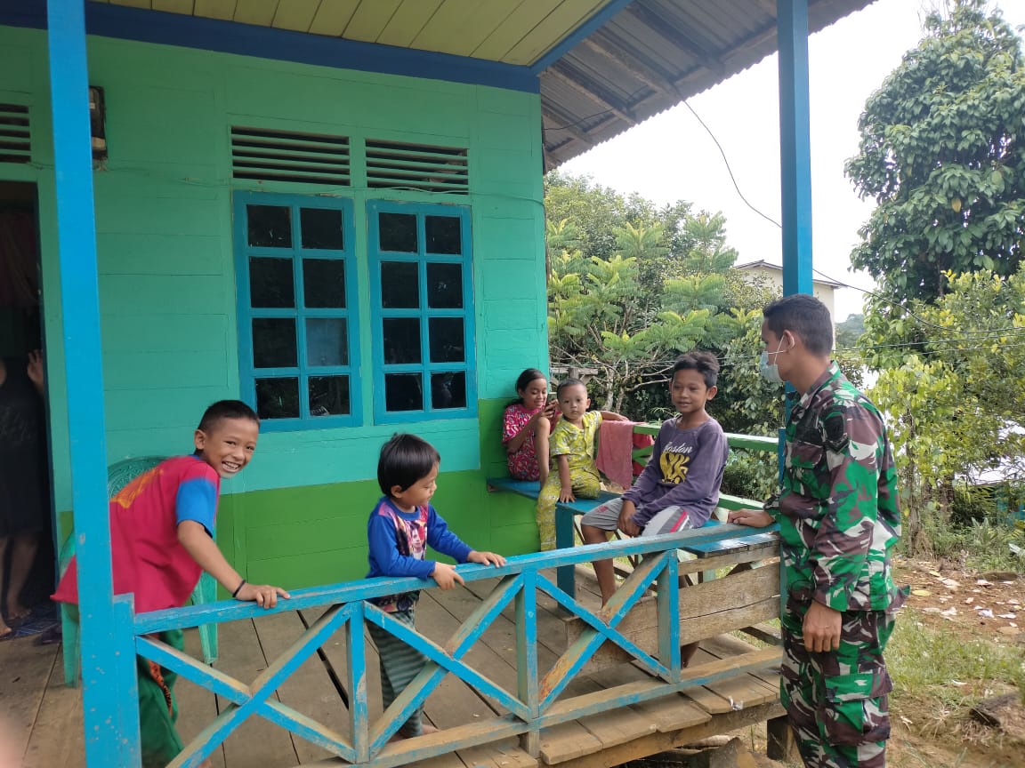 Bengkayang – Anggota Satgas TMMD ke -111 Kodim 1202/Singkawang Serda Alpon diwaktu senggangnya menyempatkan diri untuk membaur dan berkomsos bersama warga dari kalangan anak-anak hingga orang dewasa di Dusun Trimulya Desa Sentangau Jaya Jalan Trans Segorong Kecamatan Seluas Kabupaten Bengkayang.