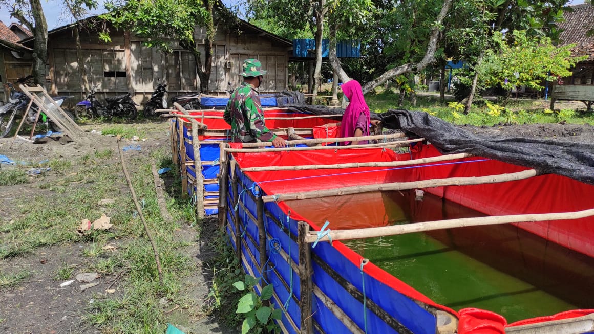 Bojonegoro – Koptu Aris Widodo, salah satu Personel Satgas TMMD 110 Kodim 0813/Bojonegoro mengunjungi Peternak Lele pemula yang baru pertama kali berternak lele yaitu Ibu Suwarti (43) warga Dusun Ngrambah, Desa Ngrancang, Kecamatan Tambakrejo, Bojonegoro.