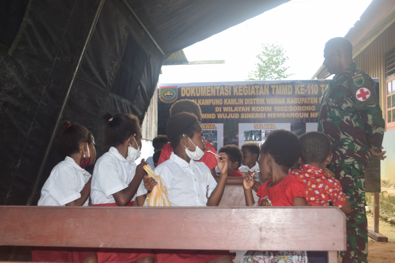 Tidak hanya meriksa kesehatan, tim medis TMMD Ke-110 juga memberikan pendamping kepada anak – anak papua yang berada di lokasi TMMD “tugas tim medis disini untuk mengatasi Personil Satgas yang sakit juga masyarakat tetapi tim medis banyak memiliki waktu untuk memberikan kontribusi kepada masyarakat disini” Kata Pawas TMMD Ke-110 Kapten Inf S. Tamaela.