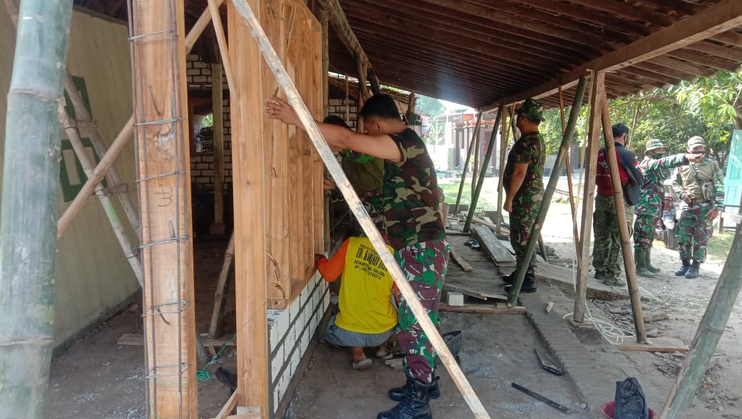 Kopda Asrob Rohmat bersama Tumiran (51) warga Dusun Pandaan RT 03 RW 02, bergotong-royong memasang daun jendela atau kusen. Pamasangan kusen untuk jendela dibutuhkan keahlian dan kerjasama, sementara Kopda Asrob sedang membantu memegangi dengan serius.