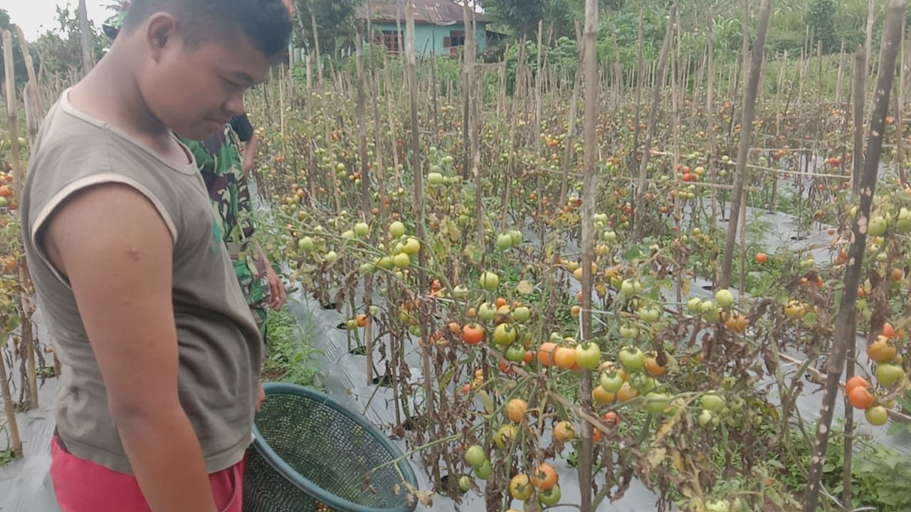 Kegiatan hari kedua puluh sembilan, Satgas TMMD ke 111 Kodim 0212/TS membantu Irwaan Sormin memanen Tomat di Desa Siuhom Kecamatan Angkola Barat Kabupaten Tapanuli Selatan.
