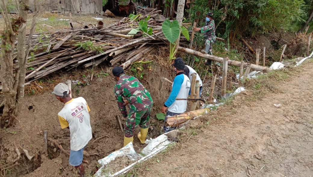 Bojonegoro – Personel Satgas TMMD ke 110 Kodim 0813/Bojonegoro di Dusun Nglambangan Desa Jatimulyo, Kecamatan Tambakrejo, Kabupaten Bojonegoro, bersama Bapak Kusno selaku Kasun beserta masyarakat bergotong-royong membersihkan parit.