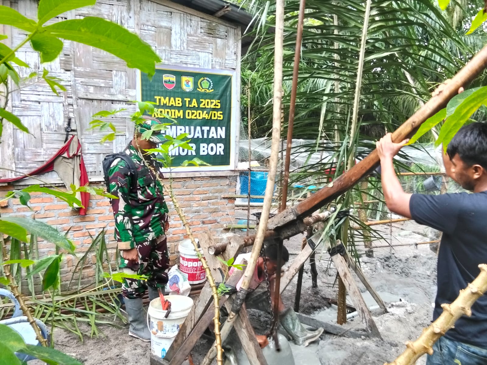 Pengeboran sumur ini menjadi langkah awal dan paling krusial dalam mewujudkan TMAB. Dengan kondisi lokasi yang becek dan berlumpur, para prajurit TNI bersama warga tetap bersemangat menggunakan alat pengeboran sederhana yang dirangkai secara manual.
