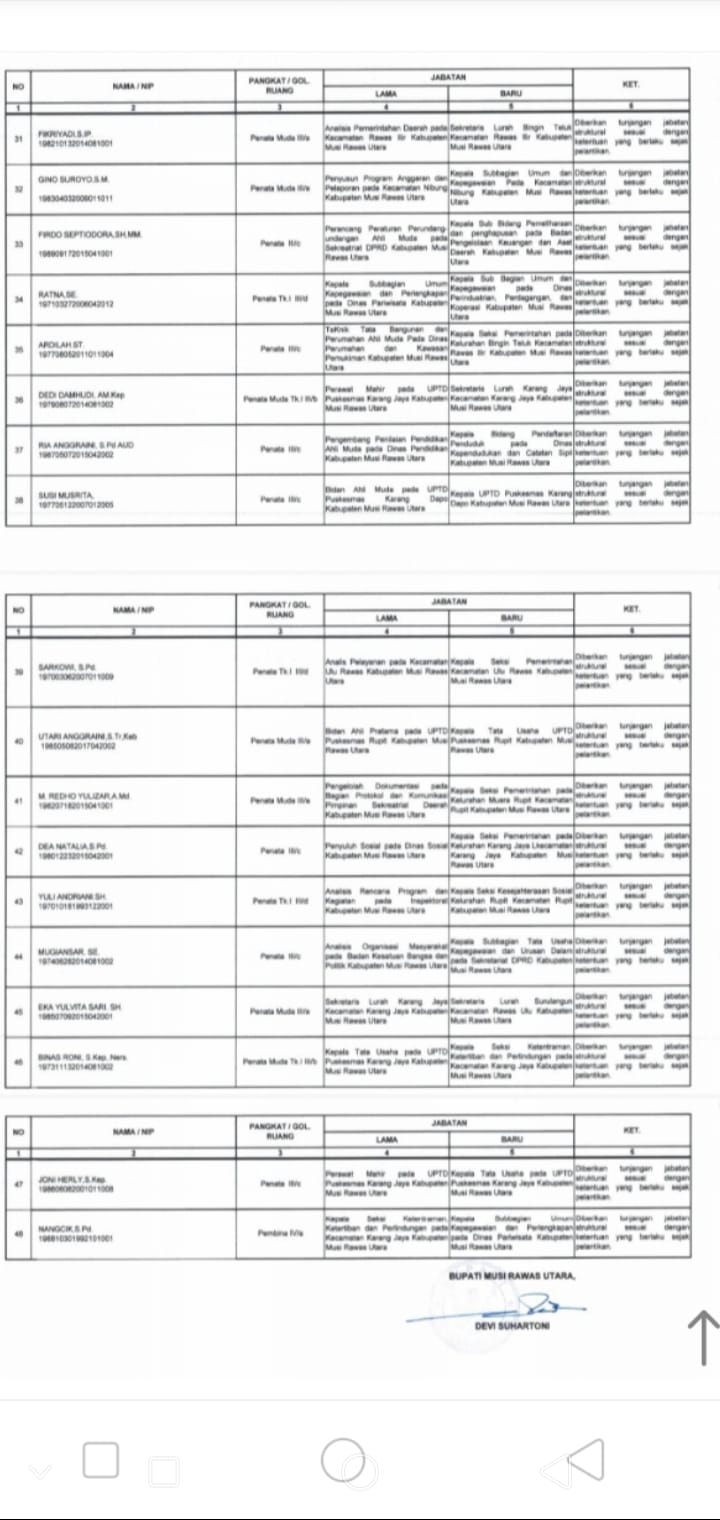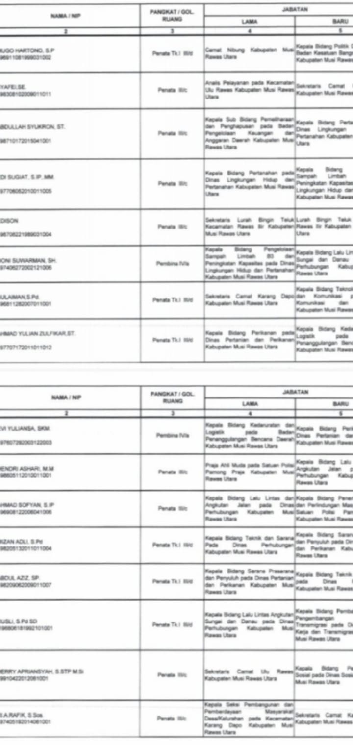 Plt Kepala BKP-SDM Kabupaten Muratara mengatakan pelantikan ini sesuai dengan keputusan Bupati Muratara nomor 821.2/005/kpps/2023 tanggal 9 Agustus 2023, serta hasil rapat Tim Baperzakat Daerah Kabupaten Musirawas Utara tanggal 7 Agustus 2023 memutuskan menetapkan ke-1 mengangkat, memindahkan, dan memberhentikan Pejabat Pimpinan Tinggi Pratama Administrator pengawas dan fungsional di lingkungan Pemkab Muratara.