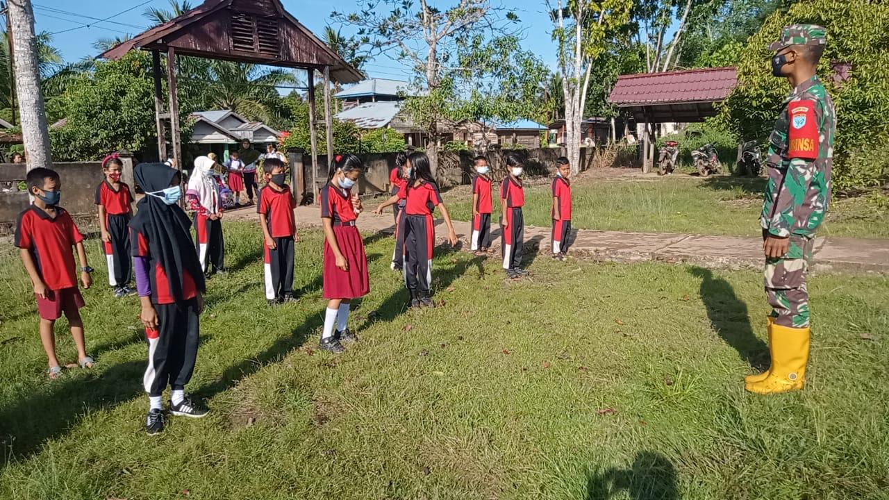 Bengkayang- Satgas TMMD ke 111 Kodim 1202/Skw Serda Yeremia memberikan pelatihan Peraturan Baris Berbaris (PBB) kepada siswa-siswi SDN 12 Segorong Desa Sentangau Jaya Kecamatan Seluas Kabupaten.