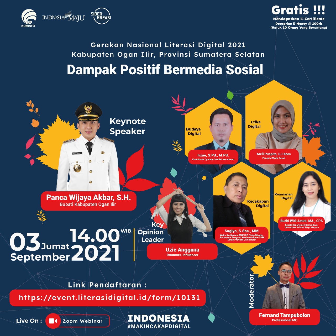 Sebagai Keynote Speaker adalah Bupati Ogan Ilir yaitu, Panca Wibawa Akbar, S.H, dan Bp. Presiden RI Bapak Jokowi memberikan sambutan pula dalam mendukung Literasi Digital Kominfo 2021.