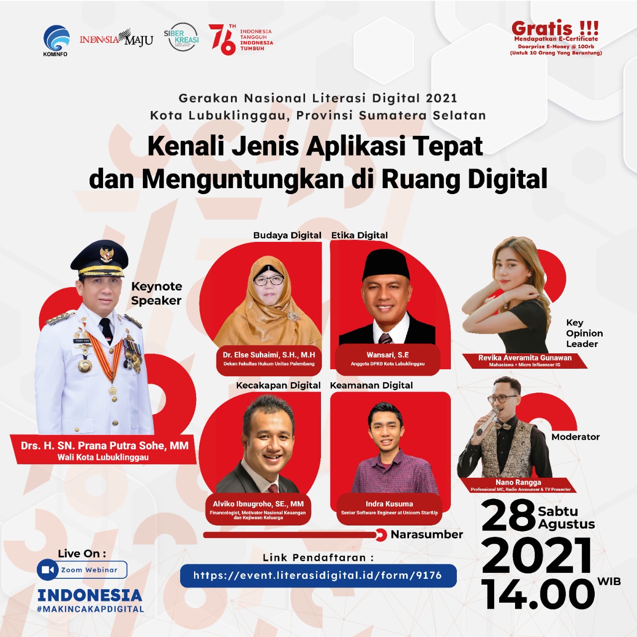 Sebagai Keynote Speaker adalah Walikota Lubuklinggau yaitu, Drs. H. SN. Prana Putra Sohe, MM dan Bp. Presiden RI Bapak Jokowi memberikan sambutan pula dalam mendukung Literasi Digital Kominfo 2021.