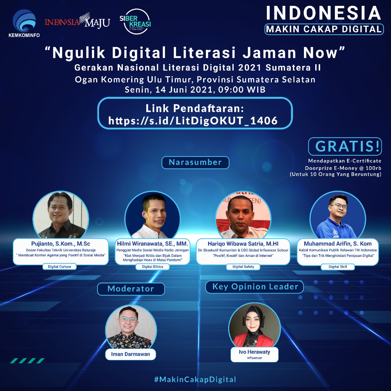 Sebagai Keynote Speaker, oleh Bupati Ogan Komering Ulu Timur H. Lanosin Hamzah S.T, menyatakan bahwa mendukung kegiatan Literasi Digital agar dapat memanfaatkan internet dan teknologi untuk hal yang positif dan kreatif serta menamba daya saing sehingga dapat meningkatkan perekonomian dan turut membangun Kabupaten Ogan Komering Ulu Timur, dilanjutkan oleh Bp. Presiden RI, Bapak Jokowi yang memberikan sambutan dalam mendukung Literasi Digital Kominfo 2021.