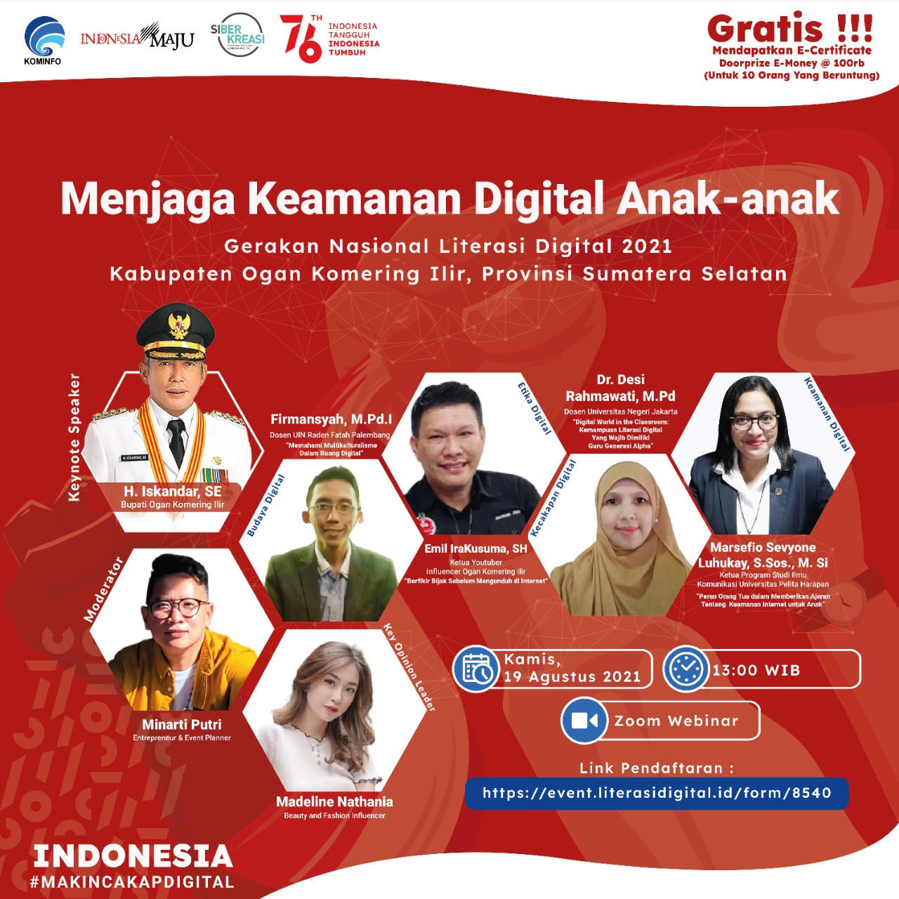 Sebagai Keynote Speaker adalah Bupati Ogan Komering Ilir yaitu, H. Iskandar, S.E., dan Bp. Presiden RI Bapak Jokowi memberikan sambutan pula dalam mendukung Literasi Digital Kominfo 2021.