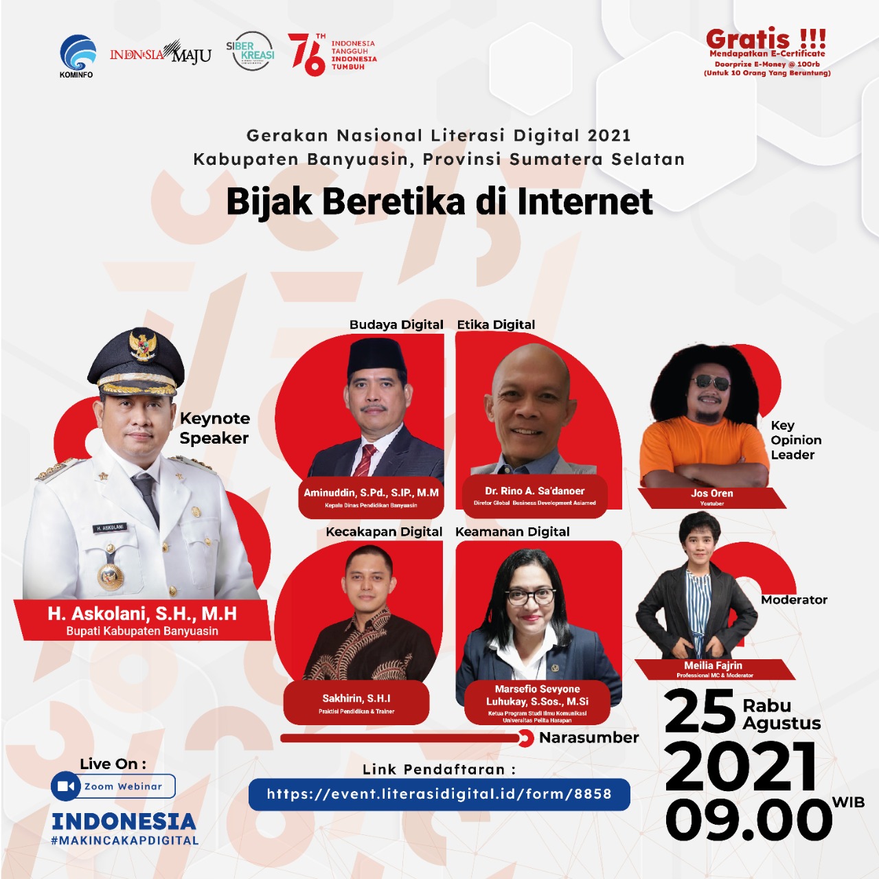 Sebagai Keynote Speaker adalah Bupati Kabupaten Banyuasin yaitu, H. Askolani, S.H., M.H., dan Bp. Presiden RI Bapak Jokowi memberikan sambutan pula dalam mendukung Literasi Digital Kominfo 2021.