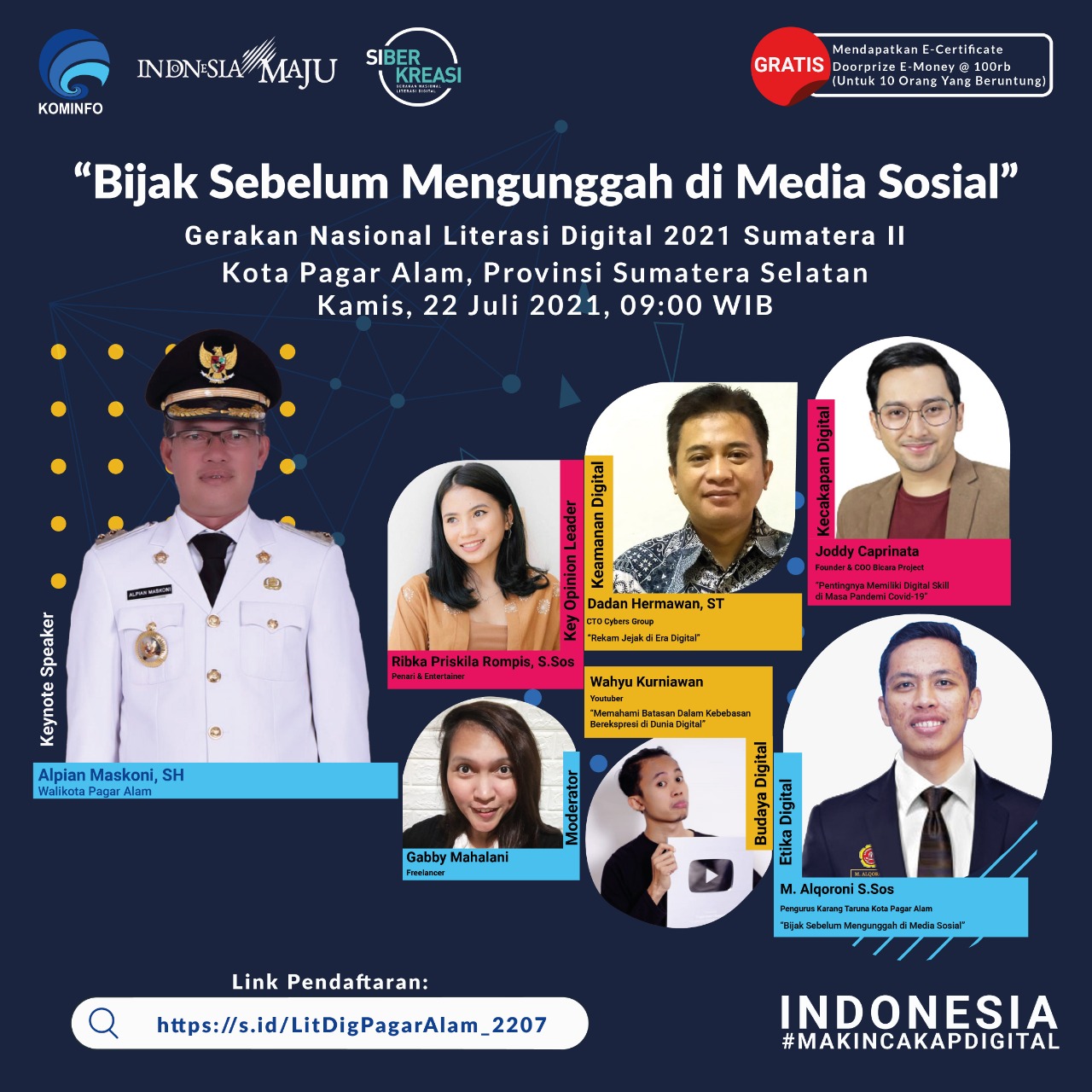 Sebagai Keynote Speaker, Walikota Pagar Alam yaitu Alpian Maskoni, S.H., memberikan sambutan tujuan Literasi Digital agar masyarakat cakap dalam menggunakan teknologi digital, bermanfaat dalam membangun daerahnya masing masing oleh putra putri daerah melalui digital platform. Bp. Presiden RI, Bapak Jokowi juga memberikan sambutan dalam mendukung Literasi Digital Kominfo 2021.
