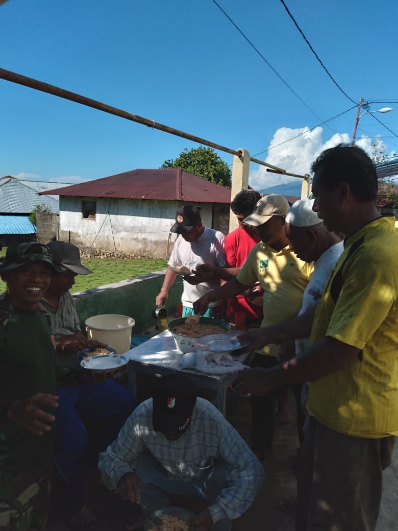 Kebersamaan dalam menjalankan kegiatan TNI Manunggal Membangun Desa (TMMD) Reguler Ke-111Kodim 1501/Ternate TA.2021 di wilayah Kec.Moti tidak hanya terlihat di saat melaksanakan kegiatan fisik saja, tapi juga di saat makan siang terlihat rukun dan akrab bersama warga.