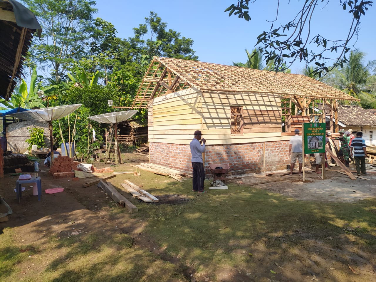 Tampak di Kampung Negeri Batin Kecamatan Umpu Semenguk Kabupaten Way Kanan Minggu (6/6/2021), Prajurit TNI dan masyarakat tampak semangat bahu membahu, di tengah cuaca yang cukup terik, bekerja bersama di sasaran rehab RTLH milik Bapak Asrip dalam Program Fisik Pra TMMD Ke-111 Kodim 0427/Way Kanan.